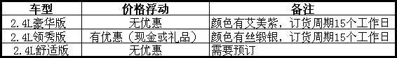 质保周期:3年或10万公里(以先到为准)保养周期:5000公里。保险公司:平安保险、中保、太平洋保险;还讲述了贷款银行:中国银行、建设银行、招商银行。(2.4L舒适版需要预定,定金5000元)讲述的还是比较详细的。购车更有机会参与广汽本田 “品质之旅”!老客户到店即可参与评估、置换有礼活动。成功介绍新用户购车更可获赠大礼!有兴趣的朋友可以联系经销商进一步了解该车型的详情。