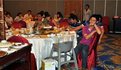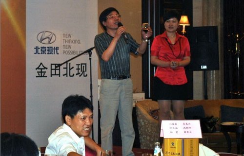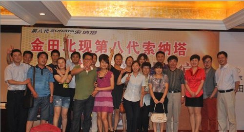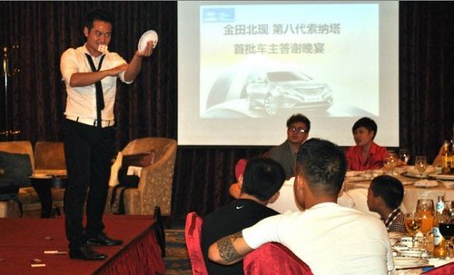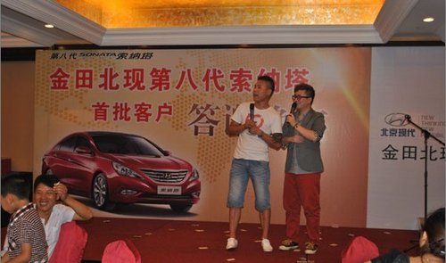 为了对第八代索纳塔首批车主进行诚意答谢,2011年7月9日,金田北现第八代索纳塔首批车主答谢晚宴在常州富都清枫苑隆重举行。出席晚宴的有第八代首批车主,常州交通台台长,以及金田北现董事长于光萍。晚宴还特别请到了常州交通台的著名DJ王鹏和李响作为司会。
