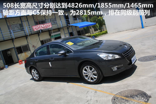 东风标致508长宽高尺寸分别达到4826mm/1855mm/1465mm,较欧洲版本的4792mm/1853mm/1456mm分别多出36mm、2mm和9mm,细小的变化归因为前后保险杠的轻微改动。轴距方面,国产车型与C5保持一致,为2815mm,排在同级别前列水平。