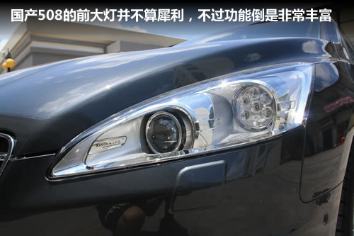 国产508的前大灯并不算犀利,不过功能倒是非常丰富。其搭载了氙气前大灯,灯组内集成了七星晶钻LED日行灯,支持远近光灯、随动转向照射、昼夜行车灯玩到补偿照明等功能,更有利于夜间行车安全性。