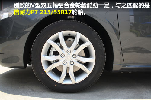标致508采用了凸起的双腰线,更显简约,又不失大气,而其门窗镀铬装饰的加入,让它看上去很有质感。旗式后视镜可以减少驾驶员的视觉盲区。别致的V型双五幅铝合金轮毂酷劲十足,与之匹配的是倍耐力P7 215/55R17轮胎。