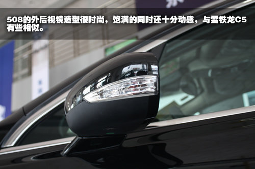 508的外后视镜造型很时尚,饱满的同时还十分动感,与雪铁龙C5的有些相似。最值得一提的是当你挂入倒挡的时候,后视镜的镜面会自动照向地,为倒车动作提供更多的路面信息,让倒车更加自信。
