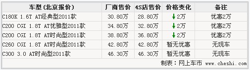据奔驰4S销售人员表示北京地区新C级C180优惠2万最低仅28.8万。C200优雅型/时尚型现车充足颜色方面有黑色、银色、白色、珍珠黄(金色)居多,优惠幅度为2万。C260/C300时尚型需要预订订金为1万,至少2至3个月可提车。