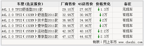 编辑点评:2011款奥迪A4L车型出色的外形设计、先进的动力系统和众多高科技配置的应用,都让奥迪A4L一上市就成为了消费者的宠儿,加长的内部空间设计更是赢得了无数国内消费者的心。目前北京地区优惠幅度很大,心动不如行动!