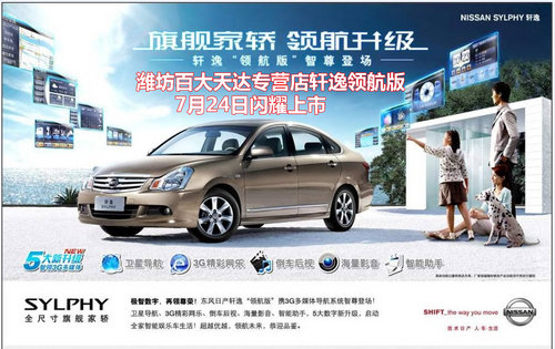 【潍坊网上车市讯】日前,网上车市编辑从潍坊百大天达专营店获悉,东风日产旗下中级王牌--轩逸华丽升级蜕变。旗舰家轿轩逸“领航版”即将傲世而出。据了解,这款实现五大新升级,齐集"科技"、"智能"、"娱乐"于一身的领航版车型,现已正式抵达潍坊百大天达专营店,并于7月24日正式迎来上市,上市当天优惠现金12000元。一场轻松"3G"车生活,即将由它书写新篇章……