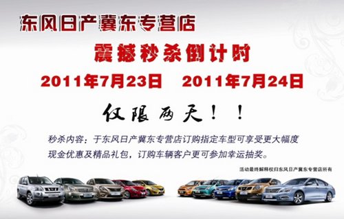【网上车市唐山讯】三伏时节,高温点燃一切激情,脉搏开始飞速律动?。”鹪倬薪饔谙质档溺戌?,要火热就火热个畅快淋漓?。《缛詹蕉ㄓ?,震撼秒杀倒计时已经敲响?。?月23日、24日,凡于店内订购指定车型即可享受超大限度现金优惠及精品礼包,更可参加幸运抽奖——绝对劲爆,不容错过!!本次活动涵盖骊威、天籁、轩逸、奇骏等经典车型,超值钜惠仅限两天!!是达人,就加入我们,为您的夏日增添一朵魔力之焰,为您的7月带来别样澎湃心潮??!