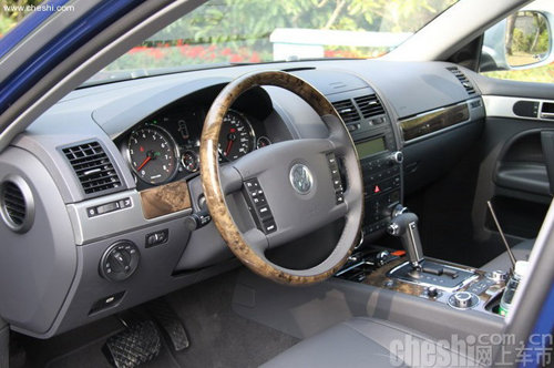途锐的内饰保持了德国车一贯的精致和严谨,均匀的缝隙和丝丝入扣的装配是大众汽车的一贯作风。秉承辉腾风格的内饰有着奢华的气息,真皮、实木和金属饰条配合得稳重又不失活泼。漂亮的如繁星般的各种控制键将中控台打扮得好像飞机驾驶舱,但恐怕要熟悉一段时间才能使用自如。布置在排挡杆后方的空气悬挂和自动水平控制、减震特性和差速锁三个旋钮倒是清楚、方便。
