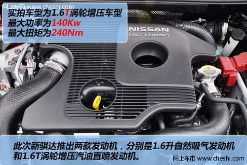 新一代TIIDA GTS采用了日产全新“T-Power”强劲动力系统开发理念,融“高动力输出+低燃油消耗”、“高响应速度”和“高稳定性”为一体,配备MR16 DIG TURBO直喷涡轮增压引擎与带6速手动模式XTRONIC CVT的全新动力组合,可以让消费者安心无忧地享受最畅快的驾驶乐趣。全新直喷涡轮增压引擎带来领先同级的澎湃动力输出,最大功率140KW,最大扭矩240Nm,使其成为国内同级量产车中升功率最大的车型,同时实现了同级最佳的加速性能。