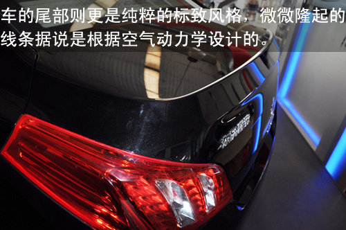 车的尾部则更是纯粹的标致风格,微微隆起的线条据说是根据空气动力学设计的,先不说它对车身有什么作用,起码使整个尾部显立体感,另外,左右双开的排气造型与原型车5 by Peugeot保持一致,体现出运动气质。