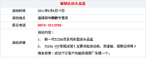 近日,编辑从曲靖地区东风日产4S店了解到,目前店内购买新骐达现车在售,本周末到店可享受店头活动,包括订车送车模等,感兴趣的朋友不妨关注一下。感兴趣的朋友不妨关注一下。详情请见下表: