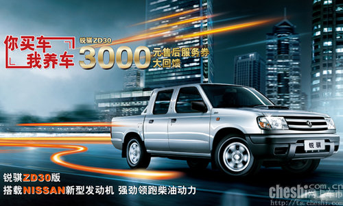 【网上车市唐山讯】2011年8月10日-10月31日,郑州日产汽车有限公司旗下最畅销皮卡之一—锐骐ZD30即将在全国范围内开展系列促销活动,在国家的汽车节能惠民补贴政策“前途未卜”的时候,郑州日产坚定出击,“自掏腰包”为消费者报销3000元,给消费者吃了一剂定心丸,让惠民政策变相得到延续。