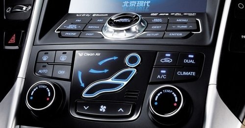 第八代索纳塔的空调控制面板设计的很直观,一个人形标致加上三个箭头,配合蓝色的背景灯光,看着就凉快。样式和沃尔沃S80很像,不管是不是模仿,无形中自我提高了一些档次。