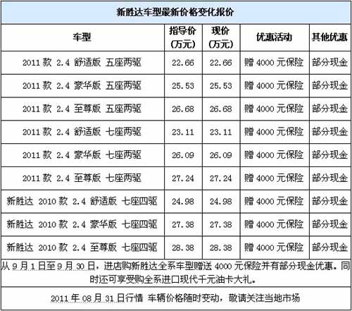 日前,编辑从苏州中现汽车有限公司了解到,为庆祝进口现代在中国市场SUV销量突破10万辆,特实施定额支援保险的客户答谢活动。从9月1日至9月30日,进店购新胜达全系车型赠送4000元保险并有部分现金优惠,同时还可享受购全系进口现代千元油卡大礼。有对进口现代新胜达感兴趣的朋友不妨致电或前往4S店内进行详细咨询,试乘试驾。详情请见下表: