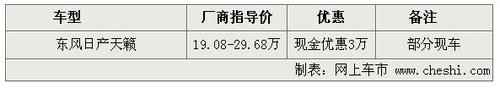 东风日产新天籁是中型车中一款以舒适著称的商务用车??沓ǖ哪谑危改宓淖龉ひ约俺旱暮阑氨甘蛊浠竦昧酥懈呒断讶禾宓墓惴喝峡?,市场关注度居高不下。近期,笔者从东风日产杭州和诚城北店了解到,天籁购车现金优惠3万元,部分现车供应。具体请见下表: