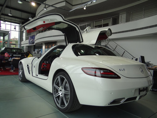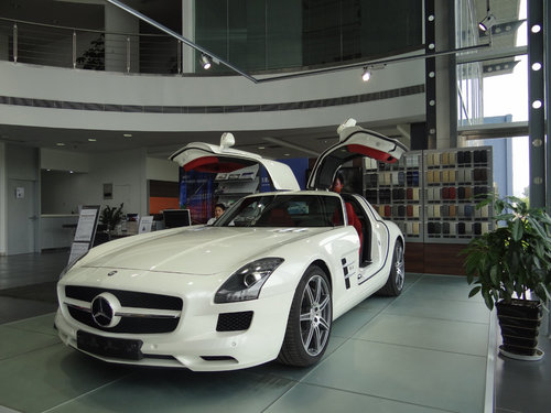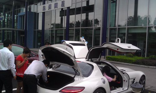 (SLS AMG刚进公司正在进行新车检查期间,立即吸引展厅客户前来观看)