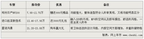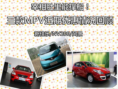 小编发现本月有三款实用性强大,价格适中的MPV,分别是郑州日产NV200,进口起亚新佳乐以及雷诺风景,来看看他们有些什么优惠吧!