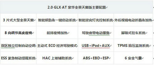 推荐车型:2.0 GLX AT自动豪华全景天窗版