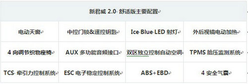 新君威很好体现了美国车的市场转型,凭借流畅的车身线条、动感的造型,新君威销售量始终很稳定。是中高级轿车市场,以动感、时尚著称的车型之一。在20万以下,有2.0舒适版一款车型可选,指导价格18.49万,该车型也是新君威的最低配车型,其主要配置如下: