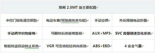 动力参数:2.0L最大功率108kw/6000rpm;最大扭矩190 N.m /4000rpm
