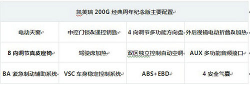 凯美瑞以其出色的均衡性和易用性在家庭轿车中一度取得霸主地位,但毫无亮点的动力总成始终是凯美瑞的软肋??廊鸾衲晖瞥龅?00G经典周年纪念版是我们比较推荐的车型,拥有多功能方向盘、8向调节真皮座椅、驾驶席加热等配置: