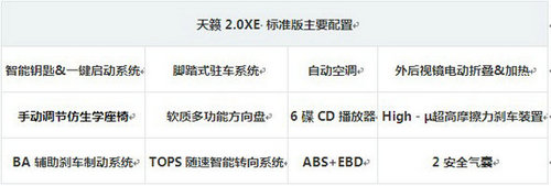 天籁从引入到换代,以其典雅的造型和出色的舒适度赢得了不少家用消费者的目光。随着入门车型价格的下探,每月销量始终保持在第一阵营。重新定位上市后的天籁在舒适性上下足了功夫,主打家居舒适路线。CVT的平顺性也是为舒适而生。18-19万区间,天籁提供了2.0EX 标准版,售价19.08万元,其主要配置如下: