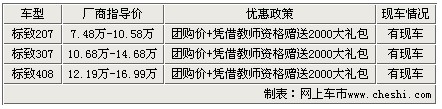 广大车友朋友们注意啦!金秋九月,中联送好礼,标致207,标致307,标致408钜惠,团购底价优惠基础之上,凭借教师资格赠送2000大礼包。礼包包括:(底盘装甲,空气治理,封釉,贴膜)。仅教师节一天,机会不容错过!祝教师节快乐!