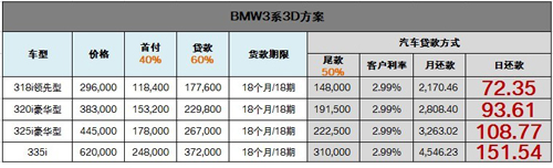 购BMW 3系尊享超值金融钜惠,超低首付,至低利率,日还款仅需72元;
