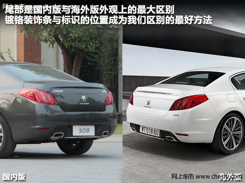 尾部成为了两款车外观上的最大区别,海外版在尾部折翼下方镶嵌了镀铬装饰条,而国内版换成突出线条所代替,想国内的大部分车型一样,尾部铭牌布置在了尾灯斜上方,儿海外版则将“508”标识嵌在右尾灯下方,尾部折线也从尾灯下止点将尾灯连接,国内版则由后保险杠分割尾部整体。