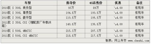 奔驰S级是奔驰全系的高端豪华车型,凭借大气稳重的外型以及奢华的配置,奔驰S级博得了不少成功人士的喜爱。小编从之信奔驰了解到,奔驰S级有部分现车,2010款 S 300L 商务型、2010款 S 300L 尊贵型、2010款 S 300L 豪华型和2011款 S 350L CGI(增配原厂车载冰箱)现车供应,其中2011款 S 350L CGI增配车载冰箱后的价格是140.80万元,现金优惠4万元;2010款 S 500L 4MATIC现金优惠8万元,2011款 S 500L CGI 4MATIC现金优惠1万元。此外,购买奔驰S级车型,符合厂家条件的,可额外赠送3万元礼包,具体车型价格请看下表: