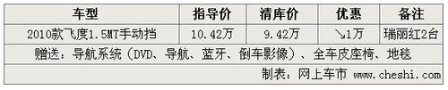 小编从广本古田店获悉,2010款飞度1.5MT手动档2台瑞丽红色现车清库价出售,赠送导航系统(DVD、导航、蓝牙、倒车影像)、全车皮座椅、地毯,具体报价如下: