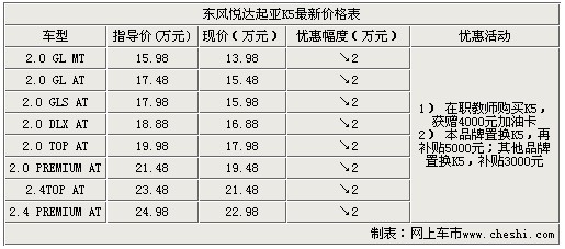 近日记者从东风悦达起亚沈阳庞大4S店获悉,为迎接教师节、中秋节、国庆节的到来, K5全系优惠2万元大礼包,此外,凡购买K5的在职教师,均可获赠4000元油卡,凡换购K5的客户,均可享受3000-5000元的置换补贴。详细信息请见下表: