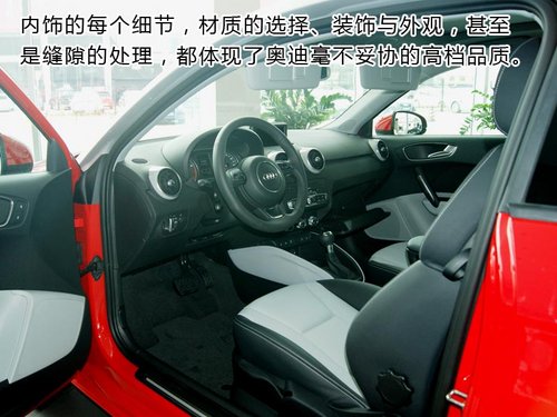 奥迪A1内饰的每个细节——材质的选择、装饰与外观,甚至是缝隙的处理——都体现了奥迪毫不妥协的高档品质。仪表盘的周围由手感绝佳的软质材料包裹,所有按钮和控制键,甚至开门手柄均可实现精准的操作。动感和高品质成为奥迪A1内饰最鲜明的特征。在内部照明方面,奥迪A1首次将LED技术完全应用于A0级小型车。不仅车门和车顶的照明灯采用了LED技术,而且内部照明灯、读书灯、脚窝灯以及装饰灯都采用LED光源。另一大设计亮点是LED导光技术,在特定的光线情况下,环绕Bose低音喇叭的LED光环会被点亮,生动地突显出音响系统的高科技特性和高品质形象。