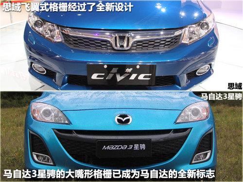 本田新思域的外观采用了概念车CR-Z的设计元素,通过上图我们也可以看到,新思域的车头前突而饱满,配合上飞翼式中网格栅使这款车看起来十分动感和时尚。而马自达3新车的大嘴格栅十分诙谐,前卫的设计让人过目难忘。