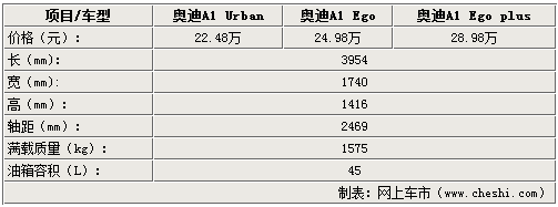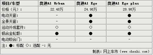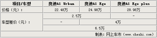 10月9日,奥迪首款A0级豪华车奥迪A1重磅上市。至此,可以说奥迪已经将家族所有车型都引进到了中国。本次发布的奥迪A1共3款,分别为Urban、Ego、Ego plus。售价分别为22.48万元、24.98万元、28.98万元。价格区别的理由为何?它们都差在哪里,到底哪款又更值呢?下面网上车市小编带您一起看看。