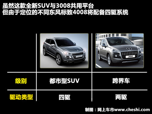 虽然这款全新SUV与进口标致3008同平台,但其实两者在定位上有很大区别。标致3008上市时便将自己定位在了跨界车上,配备两驱系统自然合情合理。而东风标致的首款都市SUV上市后将推出四驱版本,在与同级车的竞争中不落下风。另外,根据以往的惯例,凡是趋向于SUV的标致汽车都会采用”双0“的起名方式,而3008已经以进口的形式引入,所以我们推测这款新SUV将会叫做“4008“。