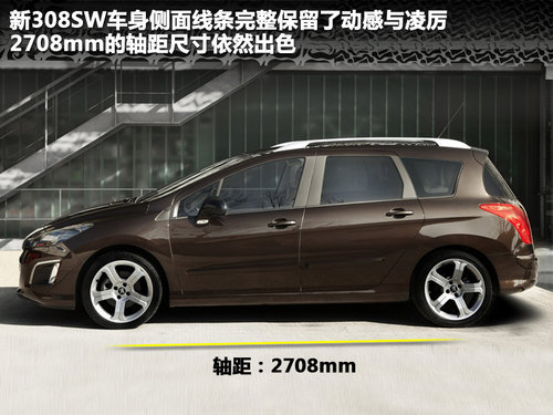 新标致308SW秉承了以往的流畅造型,凌厉的腰线从前至后一气呵成,平缓的车顶线条让308SW还带有一丝冲击力。标致308SW轴距尺寸为2708mm,很好的保证了车内乘坐空间。另外,308SW的轮毂进行了重新的设计,静态时已足够富有激情,高配版本则是采用了更显档次的多幅铝合金轮毂。