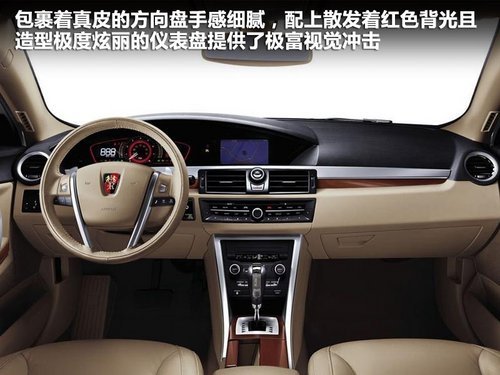 包裹着真皮的方向盘手感细腻,操作简便的多功能按键集音量控制、模式切换、行车电脑和定速巡航等功能于一体,配上散发着红色背光且造型极度的仪表盘和RIM多媒体交互系统,为2012全新改款荣威550的车主们提供了极富视觉冲击和驾驭享受的操控体验。