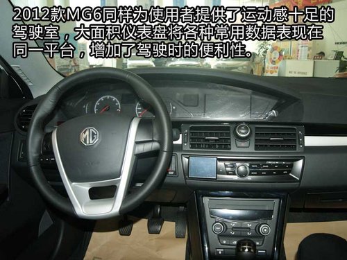 2012款MG6同样为使用者提供了运动感十足的驾驶室,大面积仪表盘将各种常用数据表现在同一平台,增加了驾驶时的便利性。MG6拥有 4653*1827*1478mm的车身尺寸以及2705mm 的超长轴距,加之Fastback设计的运用,MG6的内部空间获得了最大的优化,进而令宽敞与舒适达到了一个全新的高度,不仅超越了同级车型,也成为了自主品牌紧凑型轿车中的标杆。