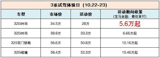10月22至23日,宜昌宝泽宝马3系试驾体验日正式启动,凡在活动期间不仅可以与我们的“运动王者”宝马3系来一次亲密接触,体验速度与激情结合的完美人生;购车者还可享受20%超低首付购宝马3系车型(最低首付仅需5.6万元起);订车者更可尊享抽取BMW 精品神秘大奖的礼遇,更多惊喜等您来参与。详情尽请致电:400 666 4019 或0717-6900777。
