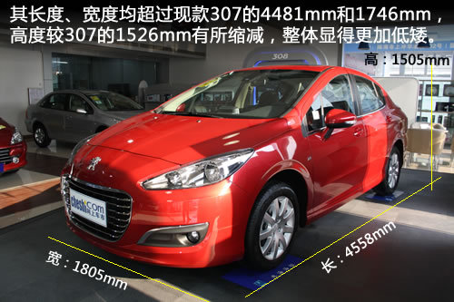 车身尺寸方面,从参数来看东风标致308的长宽高尺寸分别达到4558/1805/1505mm,其长度、宽度均超过现款307的4481mm和1746mm,高度较307的1526mm有所缩减,整体显得更加低矮。轴距方面,国产308仍维持2612mm,与现款标致307三厢完全相同,而欧版308则是2608mm,国产308稍长一点。
