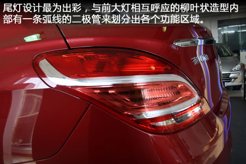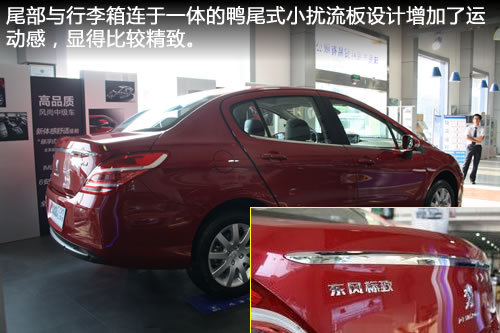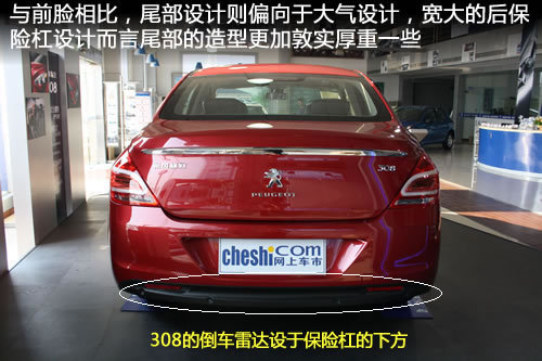 与前脸相比,尾部设计则偏向于大气设计,宽大的后保险杠设计而言尾部的造型更加敦实厚重一些,整体设计比较简洁流畅,与307三厢相比,实在要好很多。尾部与行李箱连于一体的鸭尾式小扰流板设计既不会破坏尾部的造像的整体感,也能在一定的程度上增加了运动感,显得比较精致。