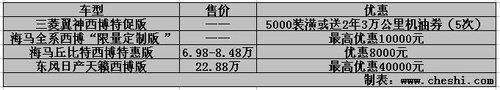 网上车市杭州讯:第十二届杭州西博车展刚刚谢幕,车展上大部分车型的优惠力度都很大,更有特别车型推出了西博特促版,小编列举了四款特促车型,分别是三菱翼神西博特促版,海马福美来西博“限量定制版”,海马丘比特西博特惠版以及东风日产天籁西博版。一起回顾一下,这几款车型的优惠吧。