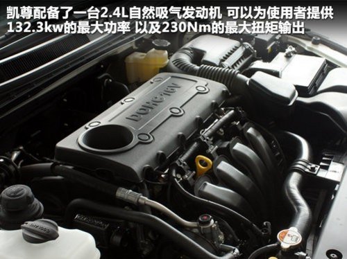 2012款凯尊的动力系统没有任何变化,继续搭载2.4升自然吸气发动机,最大功率(kw/rpm)为132.3/6000,最大扭矩(n.m/rpm)为230/4000。与之匹配的是6速手自一体变速箱,很好的将动力完美输出。