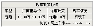 智跑为东风悦达起亚旗下一款城市SUV车型,其有着时尚动感的造型设计和较高的安全性能。智跑全系共八款车型,分别搭载2.0L与2.4L自然吸气引擎,匹配5速手动与6速手自一体变速器,价格区间为16.48-24.98万元。现店内优惠0.8万元现金,感兴趣的车迷朋友千万不要错过良机,欲购从速哦!