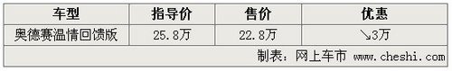 【网上车市 杭州】2009年9月广汽本田旗下全新一代国产奥德赛正式发布,此次公布售价的新车共有3款车型,售价区间为22.98-28.28万元。凭借动感时尚的外观和相对高端的配置,新奥德赛一经推出就引起了消费者的广泛关注。小编从广本古田店获悉,本周末(11月11日-13日)推出奥德赛温情回馈版,现金优惠3万元,具体如下表: