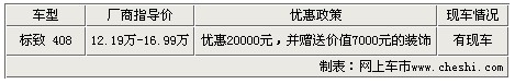 中联标致全系4s店,特别重磅推出“光棍节”双重优惠活动,凡到中联标致全系4s店购408 精装版立即优惠20000元,并赠送价值7000元的装饰。
