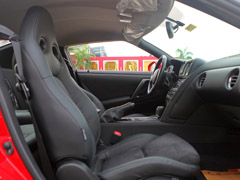 巨大的尾翼以及经典的四个尾灯,还是很能容易辨认出这是台GTR。对于时速能够超过300KM/h的跑车而言,巨大的尾翼在高速行驶作用是十分明显的,有效地减少GTR在高速行驶时的空气阻力。2012款GTR内饰基本没有改变,黑色的内饰很符合GTR跑车的身份,车内同样能看到GTR三个字母,时刻提醒你坐的是日本国宝级别的跑车―GTR。