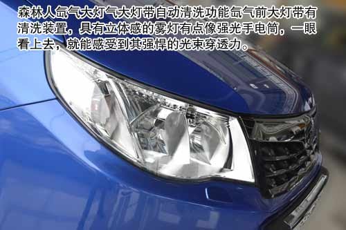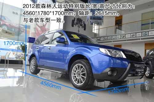 此次实拍车型为2012款森林人运动特别版,这也是此次换代推出的全新车型,既然是运动版,相关的运动元素是必不可少的,新车摒弃了老款森林人外观大面积的镀烙装饰物,车身前后都增加黑色大包围,运动气息十足。长/宽/高尺寸分别为:4560*1780*1700mm;轴距:2615mm,与老款车型一致。