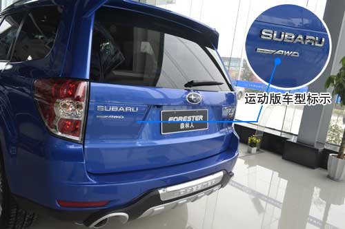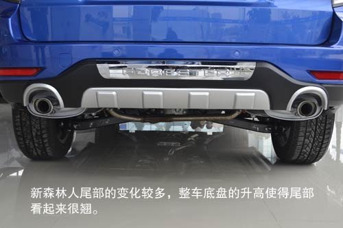相比于前脸、侧面的微改,新森林人尾部的变化较多,除了与前脸相呼应的大包围外,新车尾部右下方增加了铭板用来区别运动版与普通版车型,排气管周围装饰有银色镀烙装饰。另外,整车底盘的升高使得尾部看起来很翘。