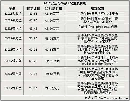 2011年11月初,华晨宝马宣布了其2012款5系长轴距轿车上市,售价相比2011款车型来说有了一定幅度的上调。不过从2012款车型本身的全新配置来说,这些上调的价格事实上也拥有较为明显的性价比优势。以下,我将与您分享2012款华晨宝马5系Li的全新亮点。(2012款5系Li尚无现车,所以本为无法提供实拍介绍)
